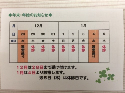 | 駐車場 | 有り/院のすぐ横5台 (第2駐車場有り) |